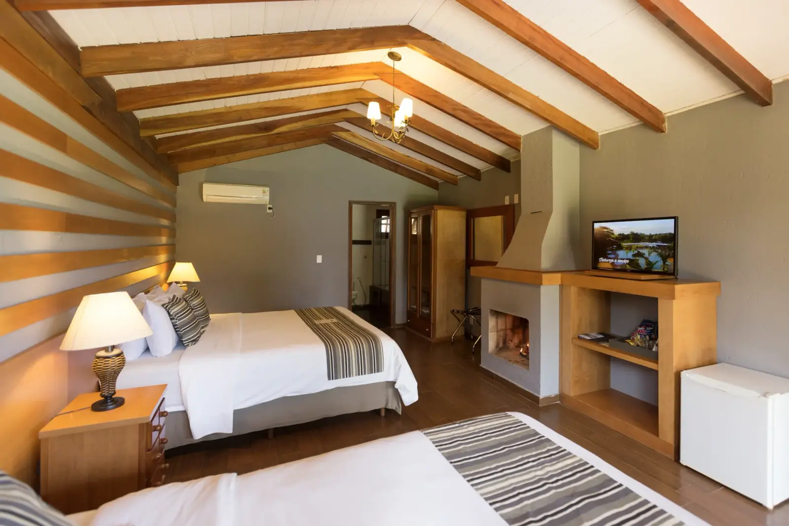 O quarto também conta com: Ar-condicionado/ Smart TV / Telefone / Frigobar / Filtro de água / Chaleira Elétrica / Secador de cabelo/ Cofre / Banheiro / Lareira. *Essa acomodação não aceita pet.